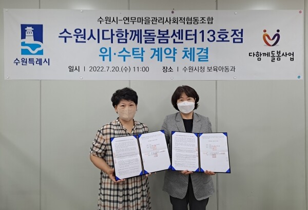 수원시는 20일 수원시청 보육아동과 사무실에서 연무마을관리사회적협동조합과 다함께돌봄센터 13호점 위·수탁 계약을 체결했다.