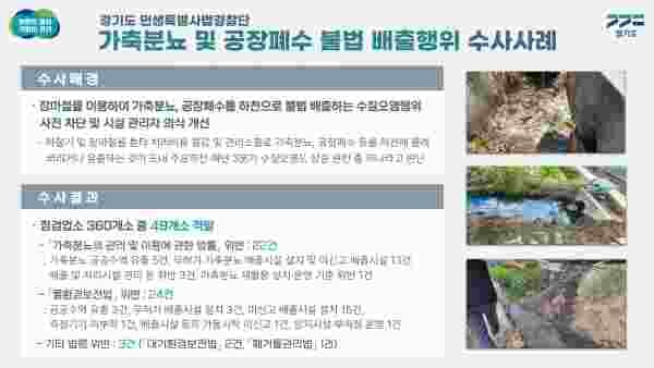 경기도 민생특별사법경찰단은 지난 6월 7일부터 27일까지 도내 31개 시·군의 주요 가축분뇨 및 공장폐수 배출사업장 360곳을 단속한 결과 가축분뇨법과 물환경보전법 등을 위반한 49개 사업장을 적발했다고 21일 밝혔다.