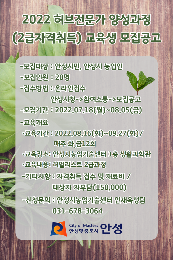 안성시는 허벌리스트 2급 자격 취득 교육을 지난해 농촌체험농가를 대상으로 실시한 바 있으며 올해 2급 취득 수료생과 함께 1급 자격 취득과정도 운영할 계획이라고 전했다.