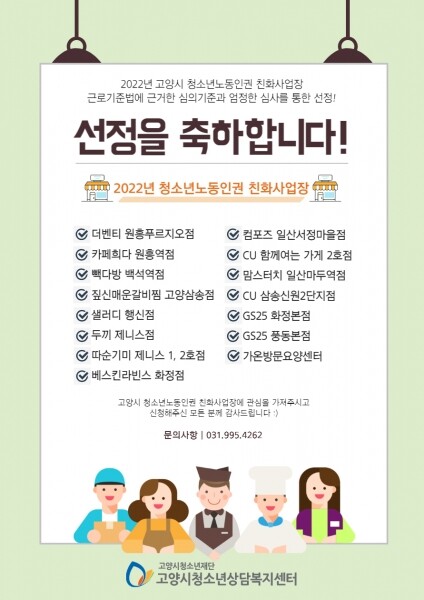 황상하 센터장은 “고양시 관내 청소년노동인권 친화사업장을 지정함으로써 청소년들의 안전한 근로환경 개선에 적극적으로 지원할 수 있는 좋은 기회가 될 것”이라며 “앞으로도 고양시 관내 청소년 노동인권 개선에 많은 관심을 부탁한다”고 전했다.