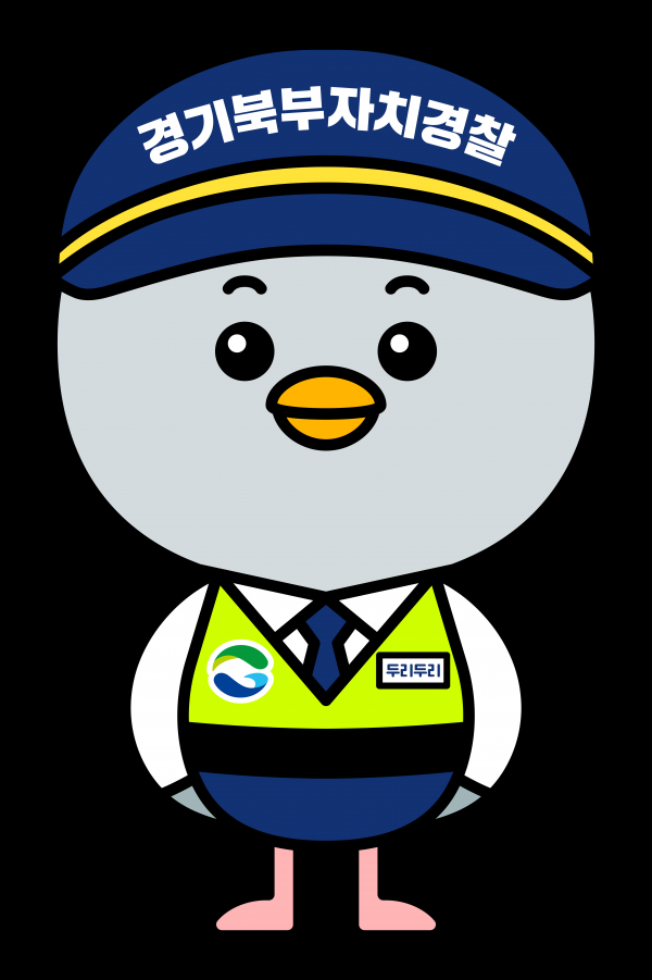 ‘두리두리’는ㅎ 경기도의 상징 새 비둘기를 의인화한 캐릭터로 경기북부 도민의 안전을 두루두루 지키는 든든함과 따뜻하고 친근하게 다가가는 모습을 그림으로 표현한 것이 특징이다.
