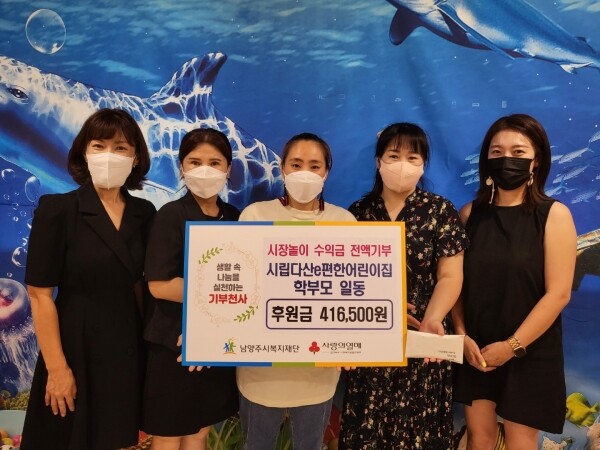 이날 전달식에는 시립다산e편한어린이집 강미영 원장과 학부모 일동, 남양주시복지재단 김미실 복지실장, 임도영 나눔사업부장이 참석했다.