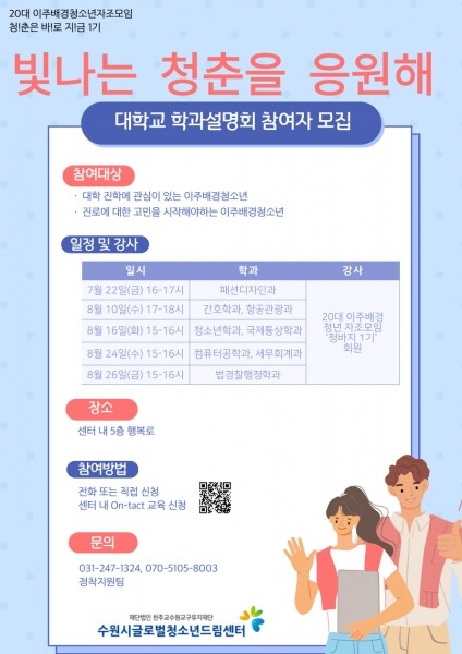 설명회는 7월 22일부터 8월 26일까지 5회에 걸쳐 수원시글로벌청소년드림센터에서 진행한다.