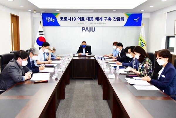 이날 간담회는 파주시 코로나19 일일 확진자가 1,000명을 넘는 상황에서 관내 종합병원과 의약계의 협조가 필요해 마련된 자리로 파주시장, 부시장, 보건소장, 파주병원장, 메디인병원장, 파주시의사회장, 파주시약사회장 등 10명이 참석했다.