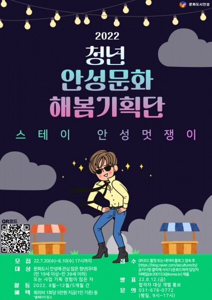 ‘청년 안성문화해봄기획단 스테이 안성멋쟁이’ 구성원이 되면 문화도시 안성 관련 사전교육을 받게 되며 회의 1회당 소정의 활동비를 지급받을 수 있고 향후 문화도시 관련 프로그램 운영 시 가점을 받게 된다.