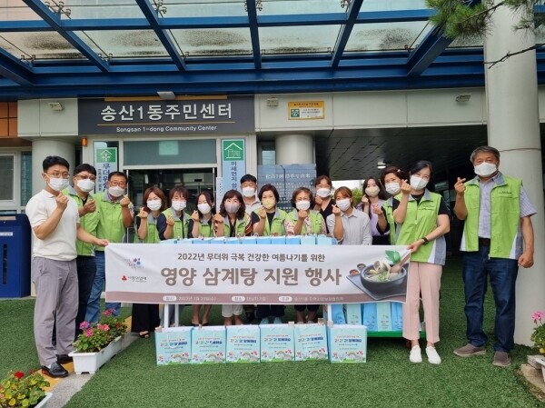 한편 송산1동은 7월 12일 닭고기전문기업 계림에프에스에서 300마리 삼계닭을 기탁받아 고산종합사회복지관과 협력해 관내 경로당 3개소 및 밑반찬 지원 대상자 150명에게 삼계탕을 지원했으며 7월 19일에는 송산1동 새마을부녀회에서 사랑의 삼계탕 나눔 행사를 실시해 취약계층 150명에게 전달한 바 있다.
