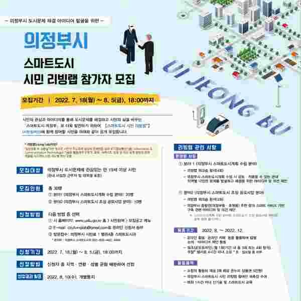 이번 시민 리빙랩 모집은 2개 분야 의정부시 스마트도시계획 수립 분야, 의정부시 스마트도시 조성 공모사업 분야에 대해 만 19세 이상의 의정부 시민 등을 대상으로 총 30명의 인원을 모집해, 8월 5일까지 의정부시 홈페이지 ‘시민참여 ’ 모집공고’ 메뉴에서 신청 가능하다.