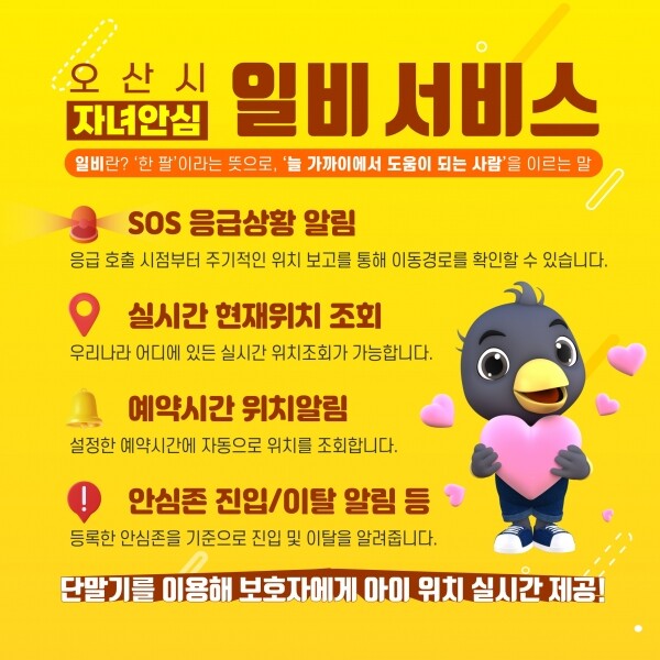 오산시 자녀 안심 일비 서비스는 SOS 응급상황 알림 실시간 현재 위치 조회 예약 시간 위치 알림 안심 존 진입/이탈 알림 등의 기능을 제공하며 7월 25일 서비스 개시를 위해 사전 접수를 진행하고 있다.