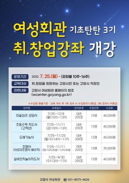 7월 25일부터 개강하는 3기에는 미술심리상담 조향사 실버인지놀이지도사 초등수학지도사 도예기능사 등 변화하는 진로 트렌드에 맞춘 강좌들이 10주~16주간 운영된다.