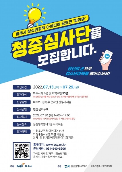 청중심사단은 파주시 청소년정책에 관심 있는 파주시민이면 누구나 참여할 수 있고 파주시청소년재단 홈페이지 또는 포스터의 QR코드를 통해 신청하면 된다.