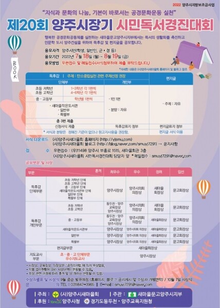 [뉴스써치] 양주시새마을문고는 양주시민을 대상으로 ‘제20회 양주시장기 시민독서 경진대회’를 개최한다고 밝혔다.