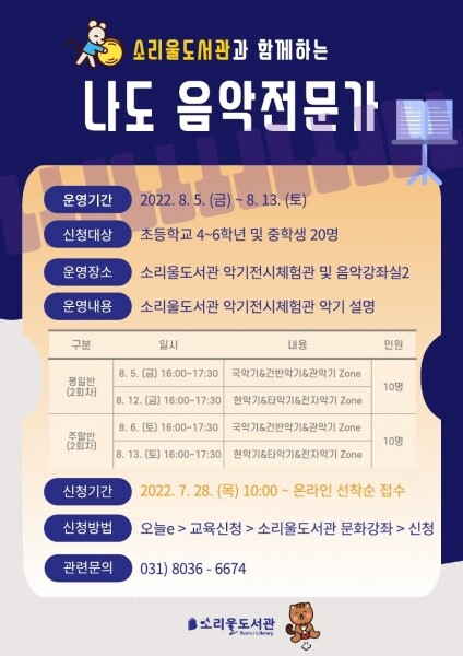 도서관 관계자는 “소리울도서관과 함께하는 나도 음악전문가 프로그램을 통해 학생들의 악기에 대한 이해를 높여, 항상 곁에 두고 연주할 수 있는 반려 악기를 선정할 수 있는 기회가 되길 기대한다”고 말했다.