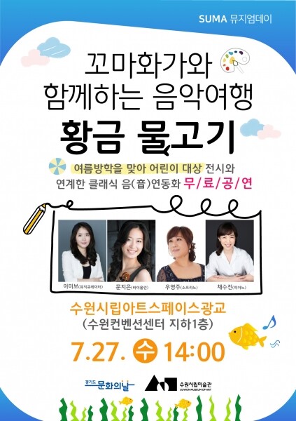 ‘꼬마화가와 함께하는 음악여행 ‘황금물고기’’는 어린이에게 친근하고 대중적인 동화 ‘무지개 물고기’를 음악연주와 함께 읽어주는 음연동화로 각색해 전문 뮤직큐레이터와 피아노, 바이올린 연주로 클래식을 어린이의 눈높이에 맞게 소개한다.