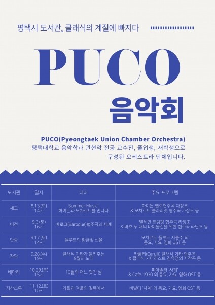 평택대학교 음악학과 관현악 전공 교수, 졸업생, 재학생 등으로 구성된 PUCO는 평택 지역 뿐만아니라 서울, 성남 등지에서 다양한 음악회를 개최하며 지역사회 문화 복지 증진에 앞장서는 단체이다.