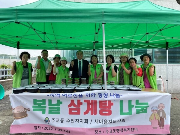 이번 나눔을 위해 주교동 주민자치회 및 새마을지도자회 회원들이 참여했으며 한약재와 찹쌀 등을 넣어 끓인 삼계탕과 아삭한 오이 겉절이를 준비해 관내 어르신 30여 가구에 방문 전달했다.