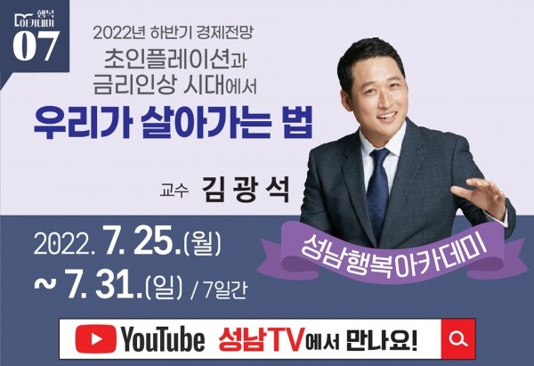 강의 주제는 ‘2022년 하반기 경제전망 초인플레이션과 금리 인상 시대에서 우리가 살아가는 법’이며 시 공식 유튜브 ‘성남TV’로 시청할 수 있다.