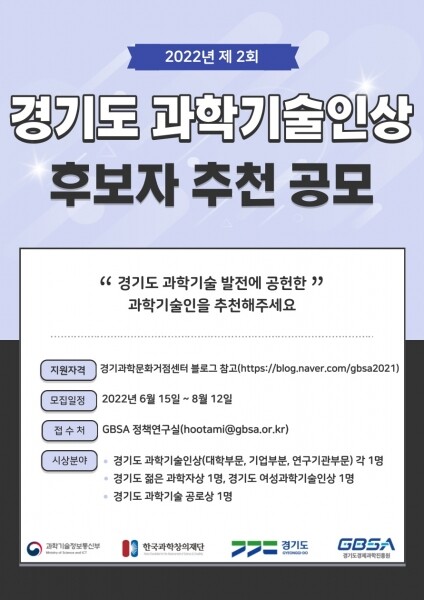 안치권 경기도 과학기술과장은 “경기도 과학기술인상을 통해 연구개발과 기술혁신에 매진하고 있는 도내 과학기술인을 격려하고 연구 의욕을 북돋는 데 기여할 것으로 기대한다”며 “앞으로도 도내 과학기술 발전을 위해 애쓰는 연구자 발굴과 지원에 힘쓰겠다”고 말했다.