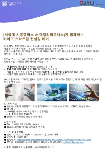 지원 대상은 SNU시흥 바이오 스타트업 캠퍼스 입주기업 및 시흥 소재 바이오 창업기업이 해당된다.
