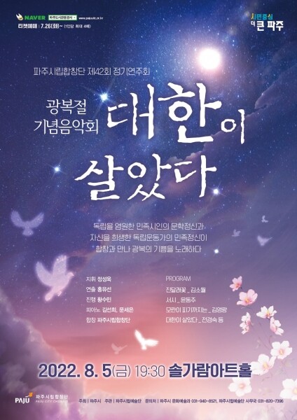 이날 공연 프로그램은 김소월의 ‘진달래꽃’, ‘못잊어’ 윤동주의 ‘무서운 시간’, ‘서시’ 김영랑의 ‘모란이 피기까지는’, ‘바다로 가자’ 등의 민족시인들의 노래와 파주 임명애 독립지사를 추모하는 ‘대한이 살았다’라는 작품을 합창으로 선보인다.