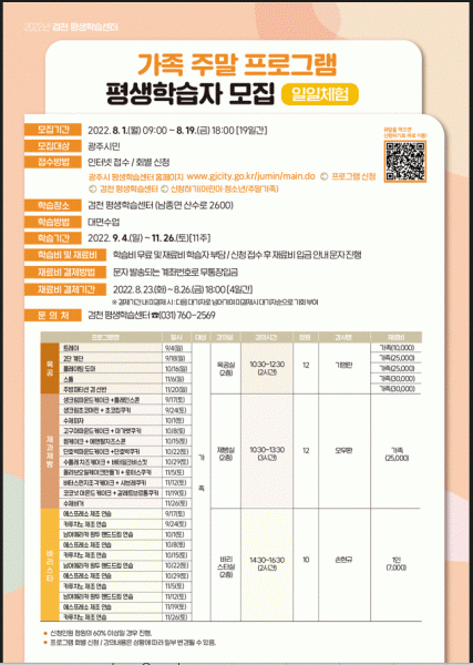 프로그램 신청은 선착순으로 진행되며 검천평생학습센터로 방문하거나 광주시 평생학습센터 홈페이지를 통해 신청 가능하다.