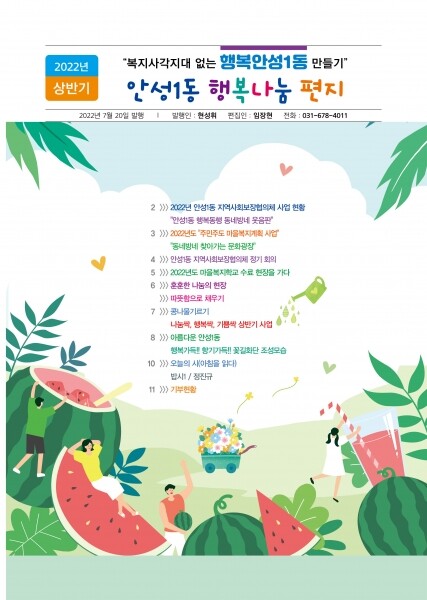 안병기 안성1동장은 “‘안성1동 행복나눔 편지’를 통해 평소 열심히 봉사하시는 분들의 소식을 지역민들에게 소개할 수 있어 기쁘다”며 “주민들과 항상 동행하며 소통하는 안성1동지역사회보장협의체에 감사드린다”고 말했다.