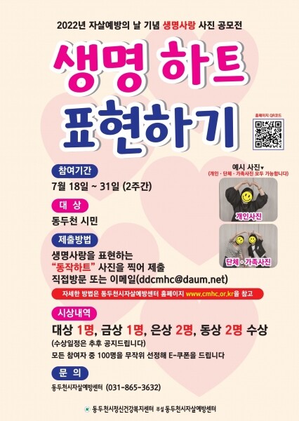 공모전 신청은 생명 사랑을 표현하는 동작 하트 사진을 찍어 센터에 방문 또는 이메일로 오는 31일까지 제출하면 되며 동두천 시민이면 누구나 참여할 수 있다.