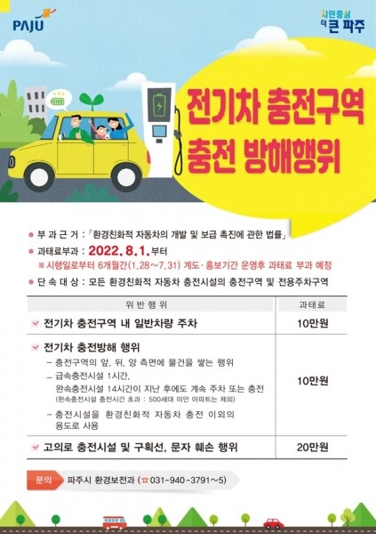 정삼섭 환경보전과장은 “전기차 보급 증가에 따라 충전 방해행위에 대한 신고 또한 늘어나고 있다”며 “과태료 처분 등의 불이익을 받는 일이 없도록 전기차 충전 공간을 비워두실 것을 당부드린다”고 말했다.