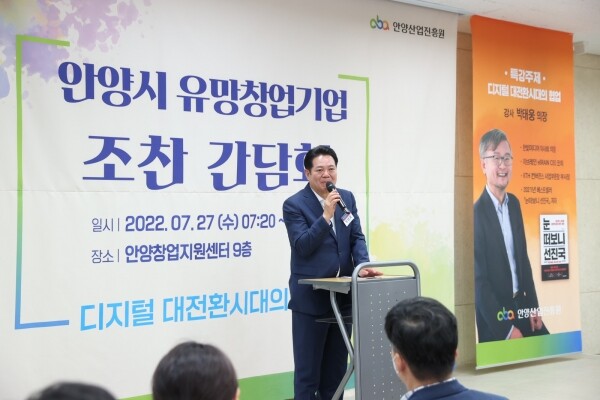 안양산업진흥원 창업지원센터 9층 강당에서 열린 간담회에서 최 시장은 고물가와 코로나19 상황이 겹친 힘든 시기지만, 디지털 대전환기를 맞아 기업들은 안주하지 않고 혁신적 노력을 기울여야 할 것이라고 역설했다.