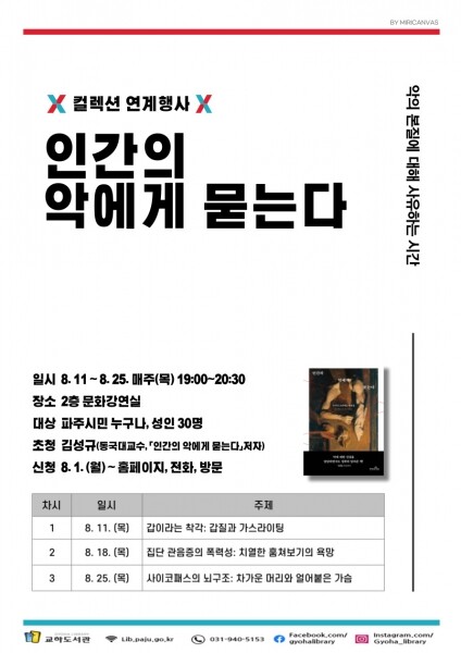 이현주 교하도서관장은 “파주시민이 가까운 도서관에서 인문학 강좌를 만나볼 수 있도록 저녁 강연을 운영하게 됐다”며 “이번 강연이 일상을 괴롭게 하는 다양한 사회문제와 인간관계의 이해를 돕는 강연이 되길 바란다”고 말했다.