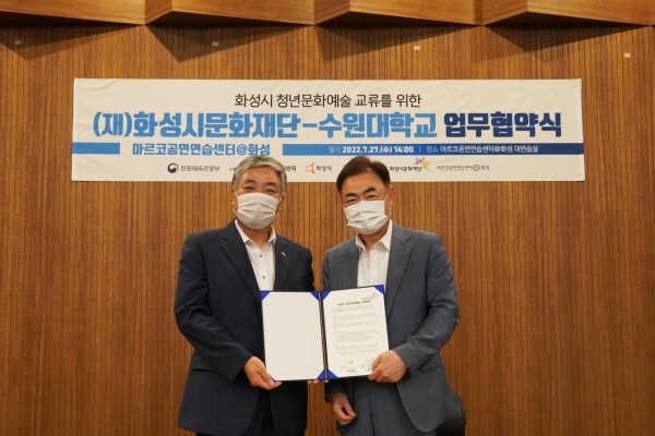 업무협약식은 아르코공연연습센터@화성 대연습실에서 화성시문화재단의 김종대 대표이사, 수원대학교 박철수 총장 등 양 기관 관계자 참석 하에 진행됐다.