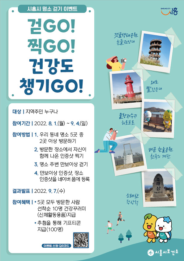 8월 1일부터 9월 4일까지 이벤트 장소로 선정한 시흥시 명소 5곳 중 2곳 이상을 방문해 지정된 장소에 자신이 나온 인증사진을 찍고 명소 주변을 만보 이상 걸은 후 네이버 폼에 인증사진을 등록하면 참여가 완료된다.