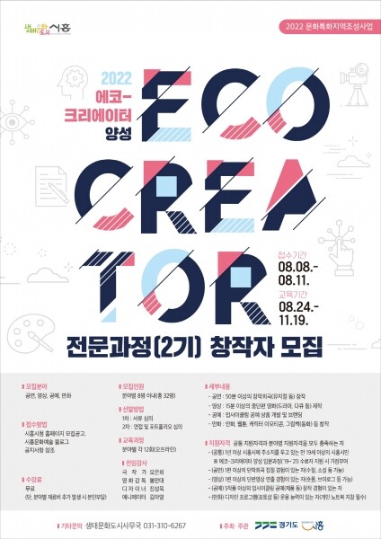 ‘에코-크리에이터 양성과정’은 시흥시를 대표하는 ‘생태문화자원’과 ‘문화콘텐츠’ 장르와의 접점을 시도해 타 도시와 차별화된 생태문화콘텐츠 발굴·제작 및 관련 전문 인력을 양성하기 위한 사업이다.