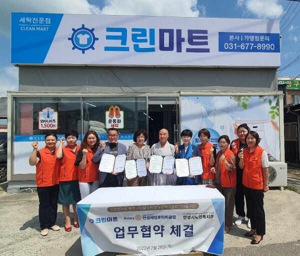안성크린마트에서 진행된 이날 업무 협약식에는 크린마트 이민흠 대표, 안성세린로타리클럽 이미화 회장 및 회원, 안성시노인복지관 운영지원사찰 칠장사 지강스님, 안성시노인복지관 김동선 관장 및 직원들이 참석했다.