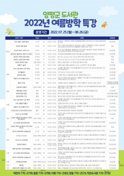 어린이도서관은 그림책 독후활동 ‘더위 꽁꽁 그림책 놀이’, 책과 명화 감상으로 세계사를 배우는 ‘알아두면 쓸모있는 명화 속 세계사’ 등 총 7개 강의를 운영하며 용문도서관은 여름 곤충과 꽃과 관련된 다양한 독후활동인 ‘여름아~ 놀자’, 전 연령을 대상으로 한 ‘캘리그라피’ 등 총 6개 강의를 운영해 독서 흥미 유발 및 사고력·창의력·감수성 향상 등 자기 계발의 기회를 제공한다.
