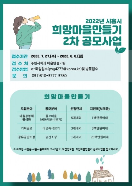 사업 신청은 시 홈페이지 고시공고란에서 서식을 내려 받아 작성한 후, 이메일 또는 시흥시청 주민자치과로 방문 접수하면 된다.