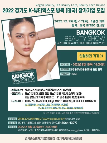 경기도와 경기지역FTA활용지원센터는 오는 12월 15~17일 3일간 태국에서 열리는 ‘2022 K-뷰티 엑스포 방콕’에 참가할 도내 유망 뷰티 관련 소비재 기업을 모집한다고 1일 밝혔다.