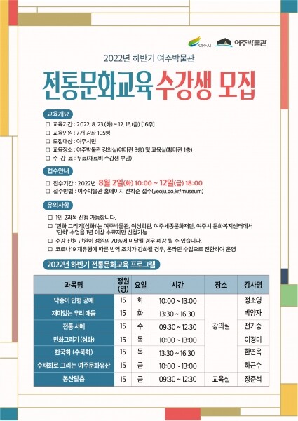 수강을 원하는 만 19세 이상의 시민은 컴퓨터 또는 스마트폰을 이용해 8월 2일 오전 10시부터 12일 오후 6시까지 여주박물관 홈페이지에서 휴대폰 및 공공 아이핀 인증 후 1인 2과목까지 신청할 수 있다.