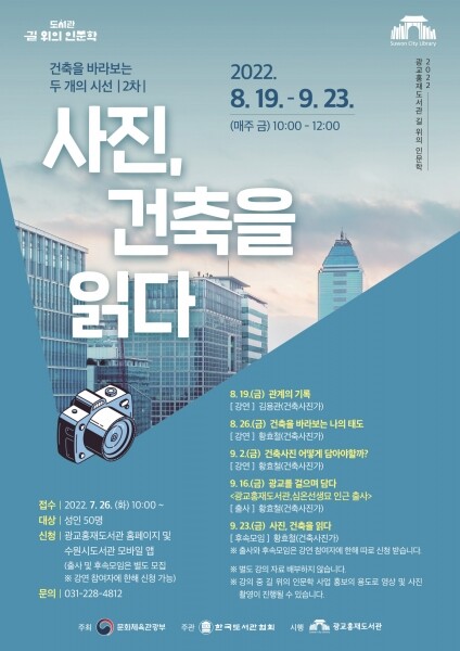광교홍재도서관 홈페이지 ‘통합예약/신청→독서문화프로그램’에서 ‘길 위의 인문학 건축을 바라보는 두 개의 시선 2차 ‘사진, 건축을 읽다’’를 선택해 신청하면 된다.