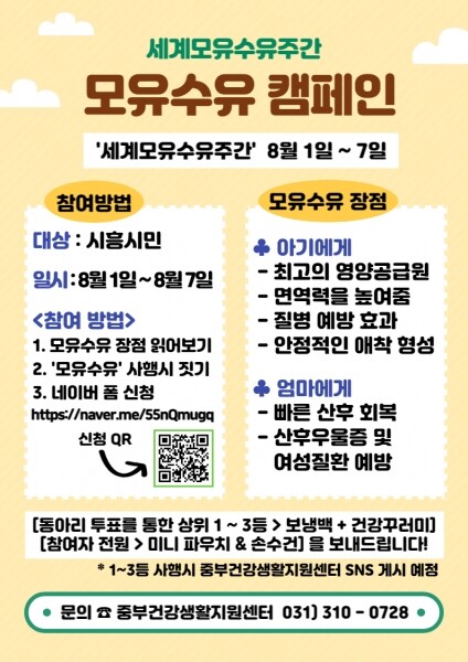 모유수유의 장점을 드러내는 ‘모유수유’로 사행시를 지어 제출하는 이번 캠페인은 시민들이 모유수유에 대해 생각해보고 좋은 점을 되새겨보는 시간을 갖게 하고자 마련했다.