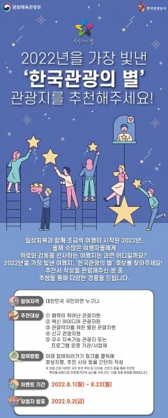 이벤트 참가는 공사 누리집 ‘한국관광의 별 특집관’에서 제공하는 양식에 따라 후보지와 추천 사유 등을 작성해 제출하면 된다.