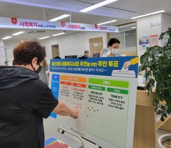 행정복지센터를 내방하는 민원인을 대상으로 투표를 진행하며 보드판 스티커 부착 방식을 통해 분야별 가장 많은 스티커가 부착된 사업을 선정해 2022년 하반기 중산2동 복지사업으로 추진할 예정이다.