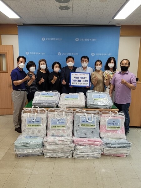 이날 전달식에는 교문2동 주민자치위원회 이종성 위원장을 비롯해 임원진 8명이 참석해, 무더위와 장마로 힘겨운 여름을 보내는 취약계층에게 조금이나마 더위를 이겨내시라는 마음을 담아 냉감 이불을 전달했다.
