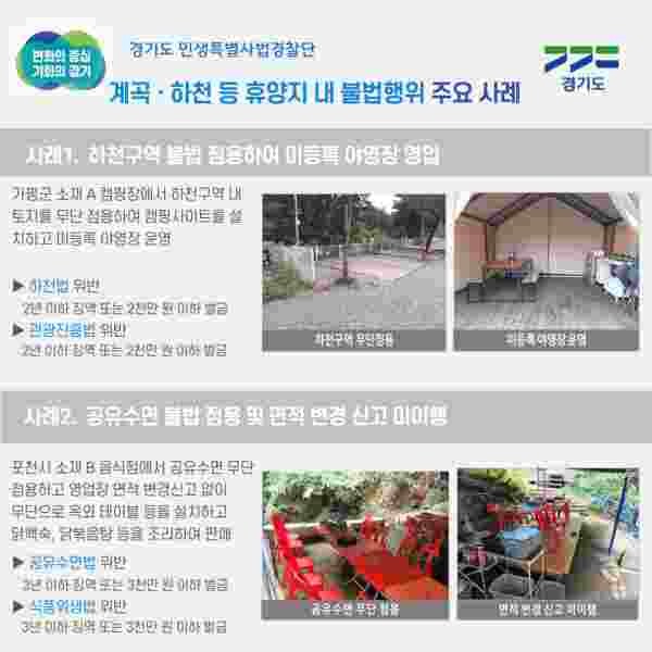 경기도 민생특별사법경찰단은 본격적인 휴가철을 대비해 지난 6월 27일부터 7월 17일까지 가평 유명계곡·어비계곡 등 도내 주요 계곡과 하천 등 휴양지 내 361곳을 단속한 결과 68건의 불법행위를 적발했다고 3일 밝혔다.