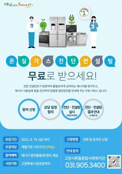 온실가스 진단컨설팅 수행기관인 고양시흰돌종합사회복지관 관계자는 “컨설팅을 통해 진단을 받은 가정은 연 5만원의 에너지 요금 절감 효과가 기대된다”며 “탄소중립사회 구축에 기여하고 생활비도 절약하는 온실가스 진단 컨설팅에 많은 시민의 참여를 부탁드린다”고 전햇다.
