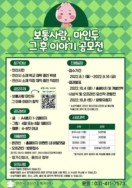정재훈 안산시 단원보건소장은 “이번 공모전을 통해 누구에게나 찾아올 수 있는 정신건강 문제에 대해 편견 없이 관심을 가질 수 있는 계기가 되길 바란다”며 적극적인 참여를 권장했다.