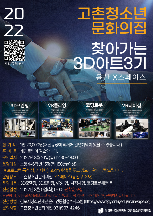 3D아트 2기 프로그램은 8월 21일 12:30~오후 6시 서울시 X스페이스 체험관에서 진행하는 초등학령기 청소년 4~6학년 15명 대상 프로그램이다.