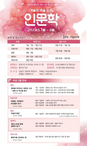 예술의 색을 입은 인문학은 영화, 미술 치유, 클래식을 주제로 총 10회차 강연 및 탐방, 북콘서트를 진행하며 코로나19 장기화로 몸과 마음이 지친 시민을 위해 예술 인문학으로 구성했다.
