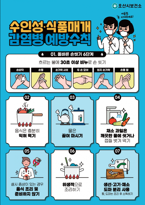 고동훈 오산시보건소장은 “수족구병은 영유아에서 많이 발생하는 감염병인 만큼 집단생활을 하는 어린이집 및 유치원 등에서 수족구병 예방관리를 위해 환자 접촉 시 개인위생을 철저히 하고 환자 관련 물품을 소독해야 하며 환자가 완전히 회복한 후 등원할 수 있도록 안내해 줄 것”을 당부했다.