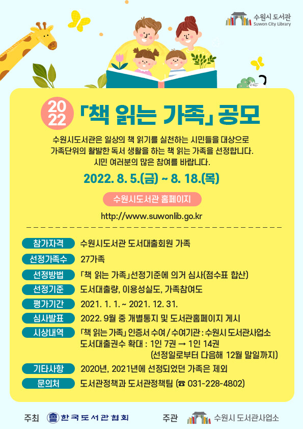 수원시도서관 도서 대출 회원은 누구나 신청할 수 있으나 2020~2021년에 선정됐던 가족은 제외된다.