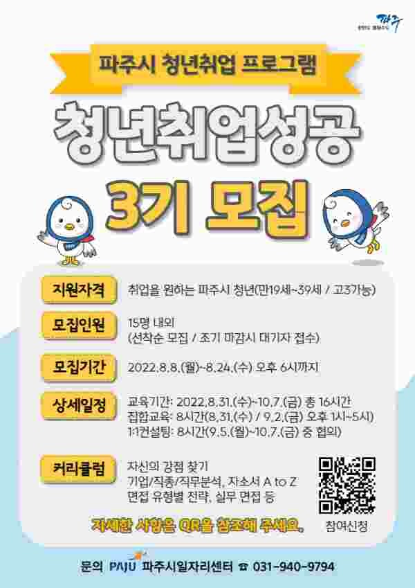 참여 자격은 만 19세~39세 파주시 청년 구직자 또는 관내 고등학교 및 대학교 졸업예정자로 신청은 포스터 내 QR코드, 파주시일자리센터 방문 또는 이메일로 하면 된다.
